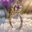 Щось нестандартне. Таке, що одразу помічаєш та запам'ятовуєш. Дике та елегантне одночасно.Яскравий ідеальний аметист, помаранчевий сапфір, що перегукується з золотом поруч, текстурність в парі зі сліпучим блиском.